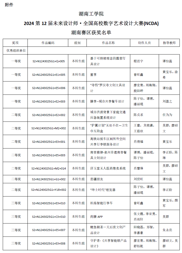 近日,英国上市公司官网365首次组织参加的第12届未来设计师–全国高校数字艺术设计大赛传来喜讯,程思宇同学的参赛作品《基于可持续理念的露营灯具设计》在全国赛中获得一等奖;曾旺鑫同学的参赛作品《蜜享》获全国赛二等奖;廖宏青等同学的参赛作品《“寺悟”罗汉寺文创文具设计》及陈子怡等同学的参赛作品《膳享--城市共享餐车设计》获全国赛三等奖。此次获奖也创造了英国上市公司官网365设计类全国大赛新的历史。