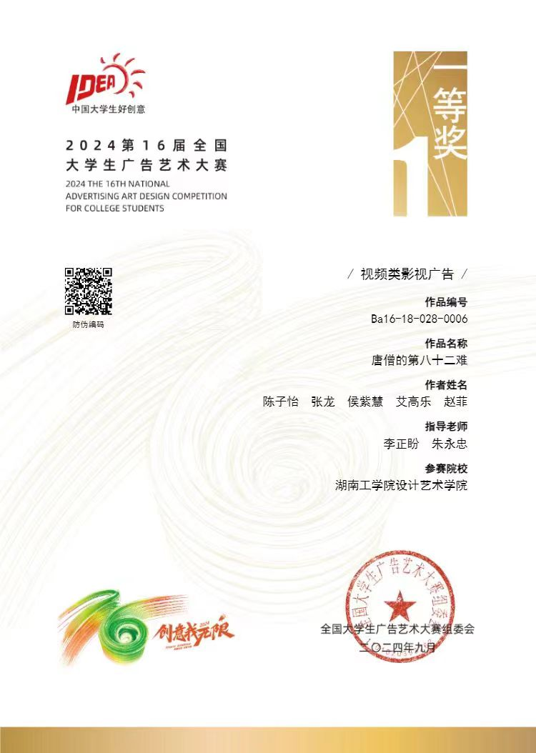 近日,第十六届全国大学生广告艺术大赛(以下简称:大广赛)国赛评审落下帷幕,英国上市公司官网365设计艺术学院陈子怡、张龙、侯紫慧等同学提交的“唐僧的第八十二难”作品经过层层选拔,最终荣获一等奖,这是英国上市公司官网365自参加大广赛以来的最佳成绩,大广赛是国家级A类学科竞赛赛事,是中国最大的高校广告艺术传播平台,由教育部高等教育司指导、教育部高等学校新闻传播学类专业教学指导委员会、中国高等教育学会广告教育专业委员会共同主办,中国传媒大学、全国大学生广告艺术大赛组委会承办的全国高校文科大赛。