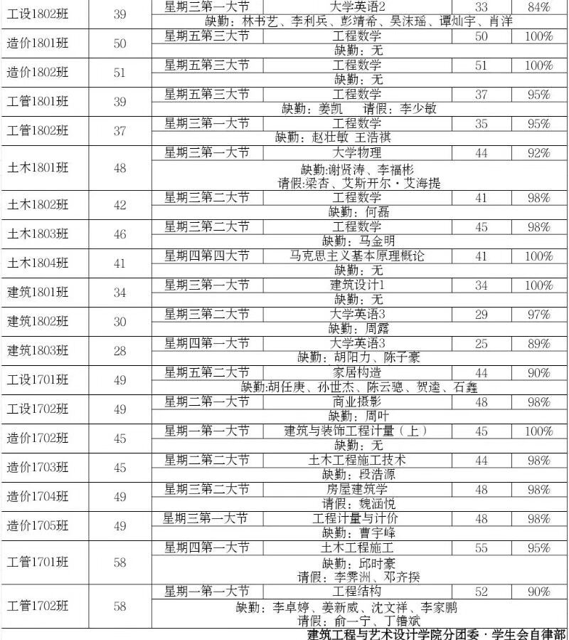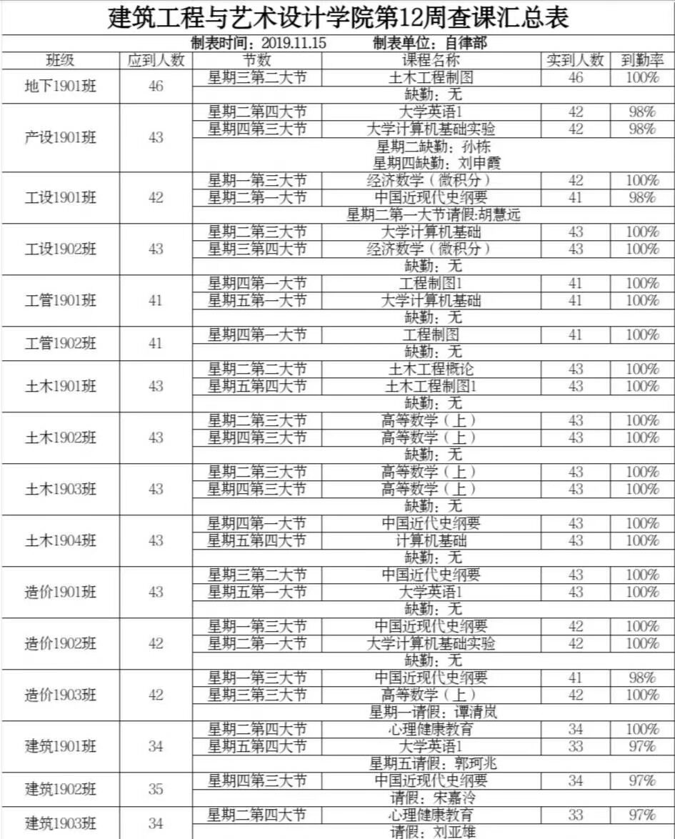 建筑工程与艺术设计学院第12周查课汇总表
