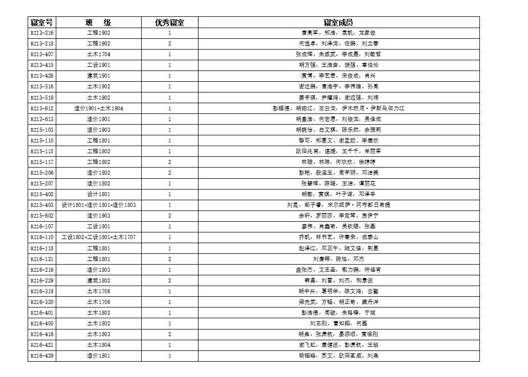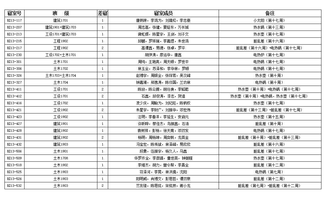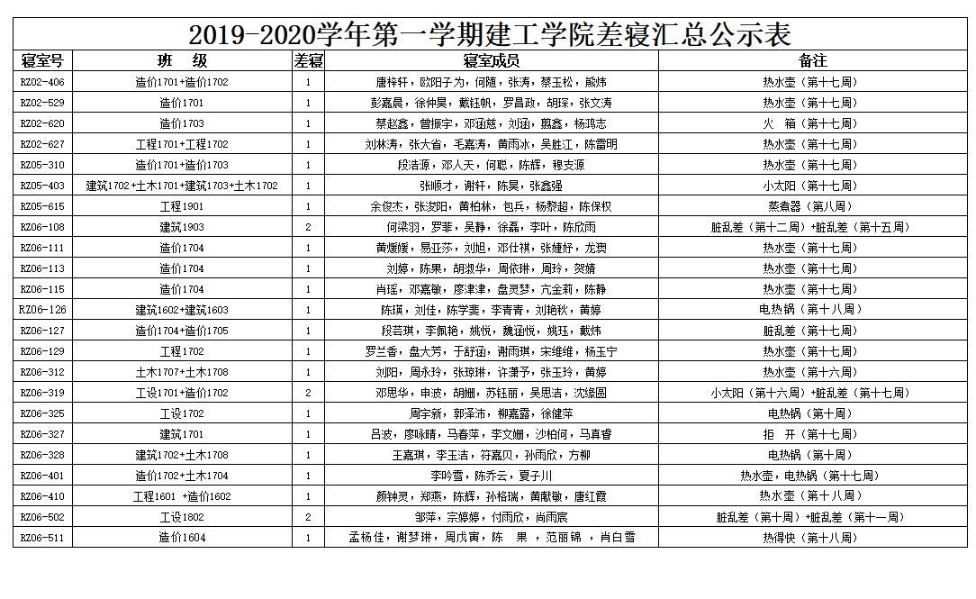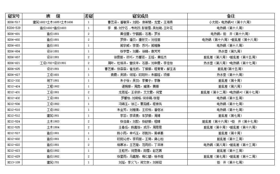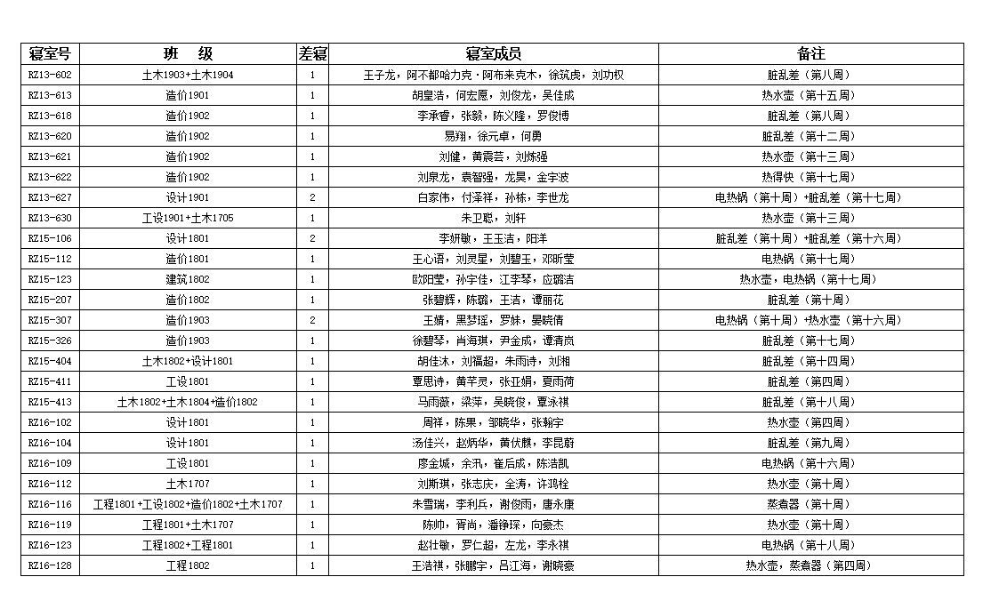 至上周,本学期的查寝情况汇总也已经出来,具体内容如下图 此次数据已引起辅导员的高度重视,希望各班委与寝室长对此也能重视起来,起到监督与带头的作用,同时希望做的好的寝室能够继续保持,做的不好的寝室也要多多改善,我们也将根据相应的规章制度,对下列寝室作出相应的奖励与惩处。(文/宿管部)