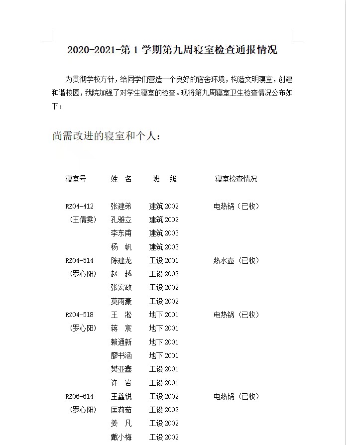 第九周突击检查寝室公示表