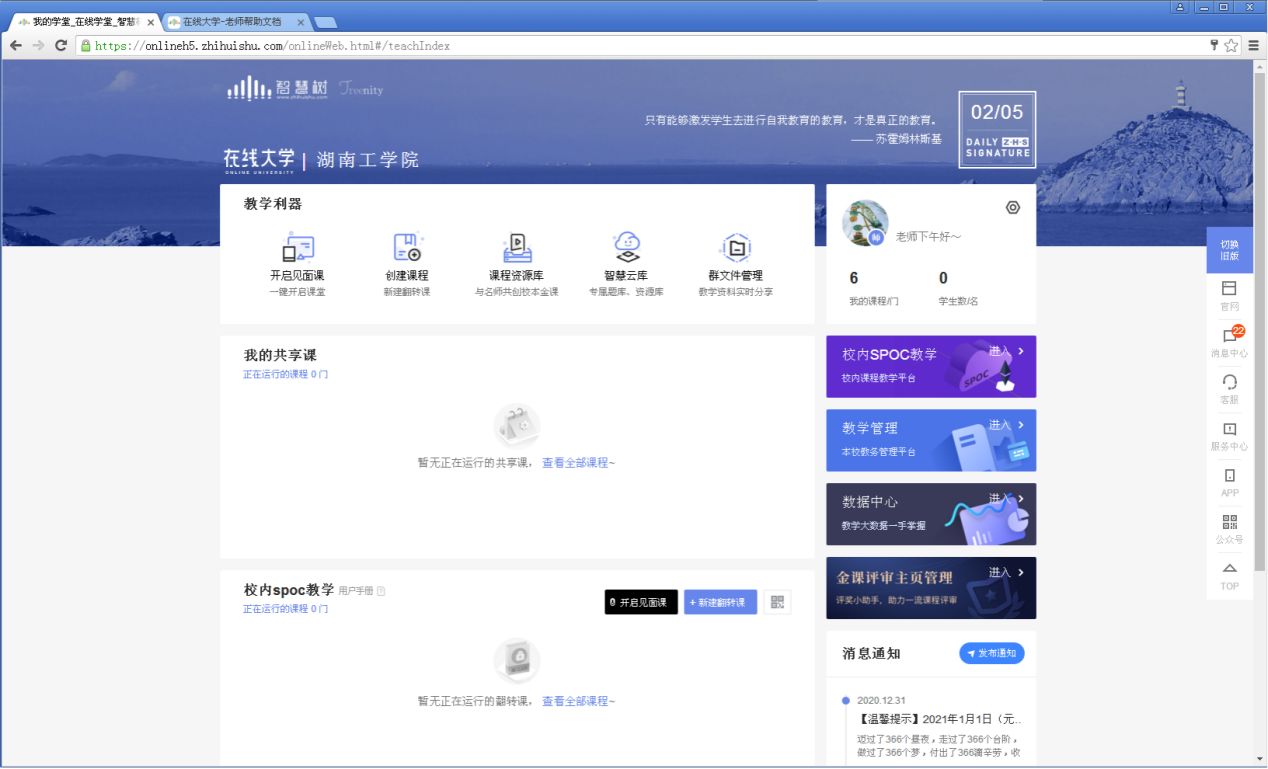 信息化教学是深入开展课堂教学革命的重要手段,也是一流课程建设重点考察内容,学校也会在教学检查和教学评价中逐步增加信息化教学的相关指标。在2020-2021-2学期期初教学检查中,所有任课教师提交的教案、教学进度表等教学文件都要体现出信息化教学手段,也是教学督导检查的重要内容之一。希望全体教师重视信息化教学的突出作用,不断完善教学方法和手段,不断提升课堂教学质量。