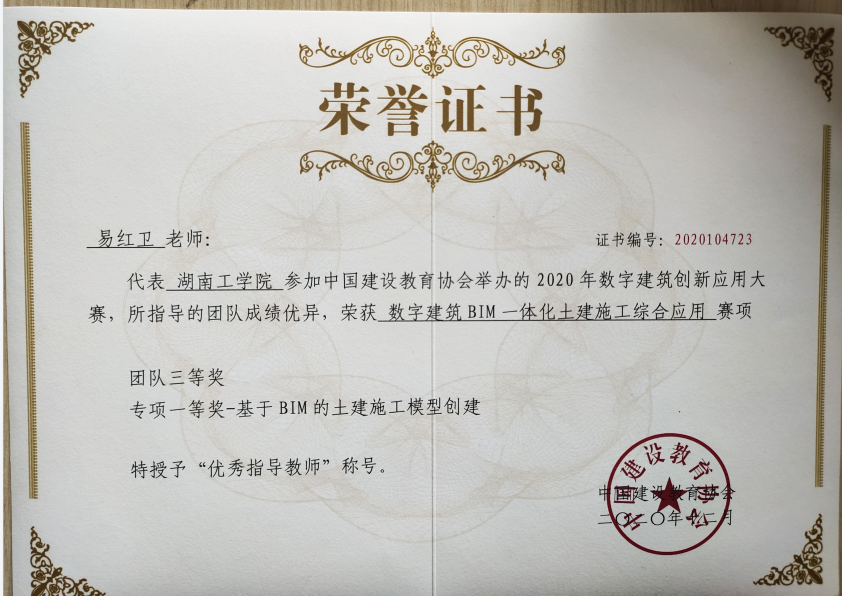 (2)中国建设教育协会举办的2020年数字建筑创新应用大赛,荣获“数字建筑BIM一体化土建施工综合应用赛项”团队三等奖,专项一等奖。