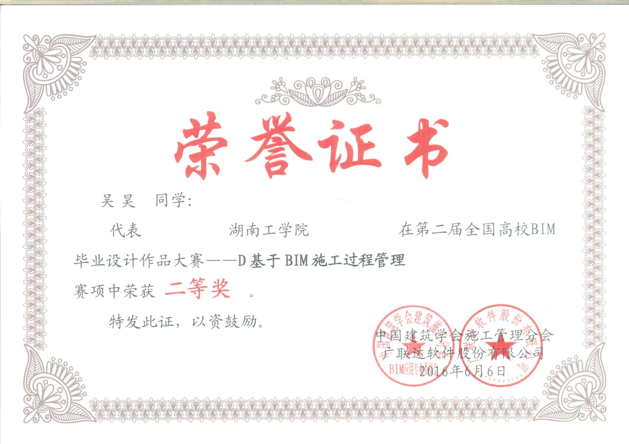 (1)“第二届全国高校BIM毕业设计大赛”全国二等奖。
