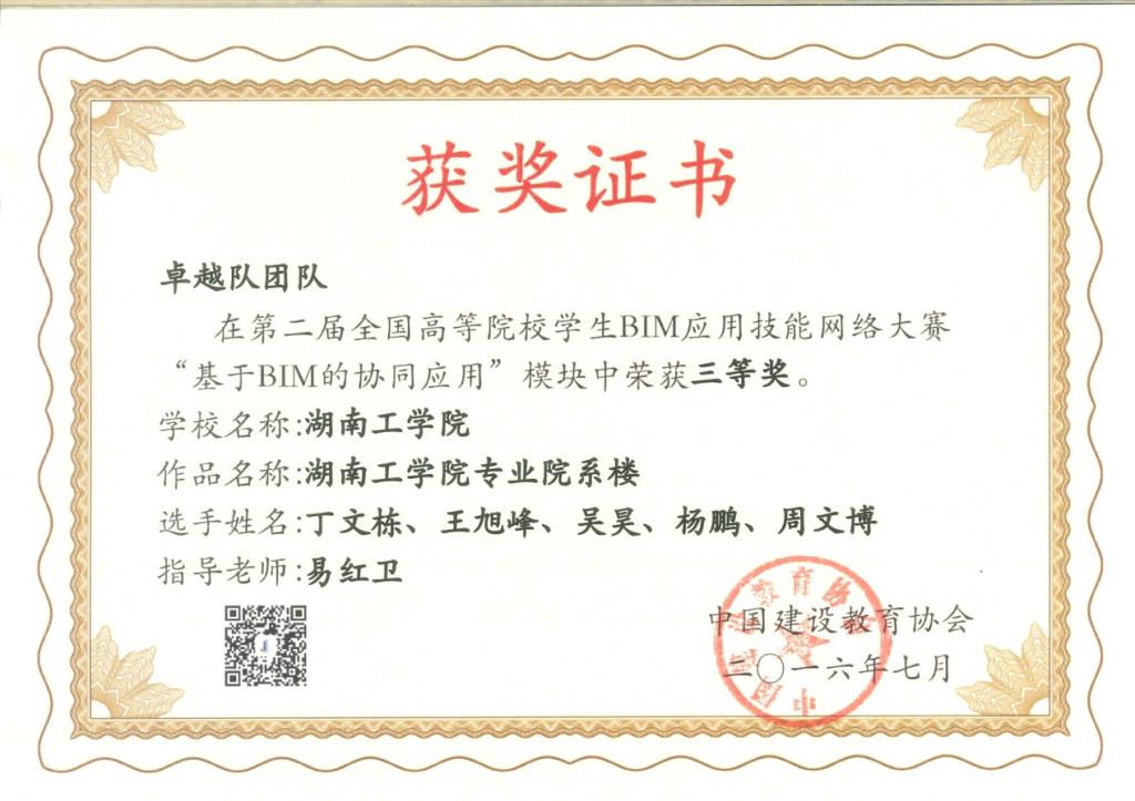 (2)第二届全国高等院校学生BIM应用技能网络大赛中荣获团队三等奖。