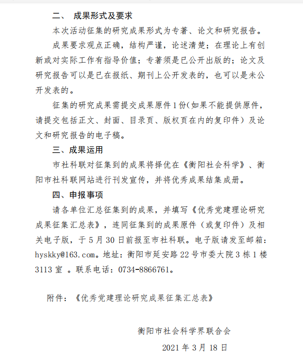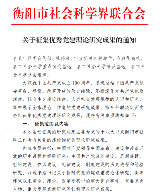 转发:衡阳市社科联关于征集优秀党建理论研究成果的通知