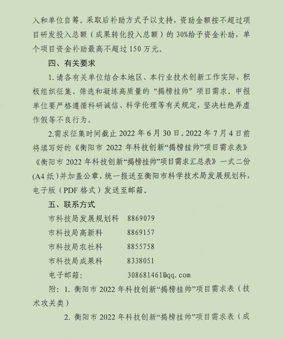 转发:关于征集2022年衡阳市科技创新“揭榜挂帅”项目需求的通知