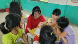 图3 指导老师和团队成员给小朋友讲解红色故事