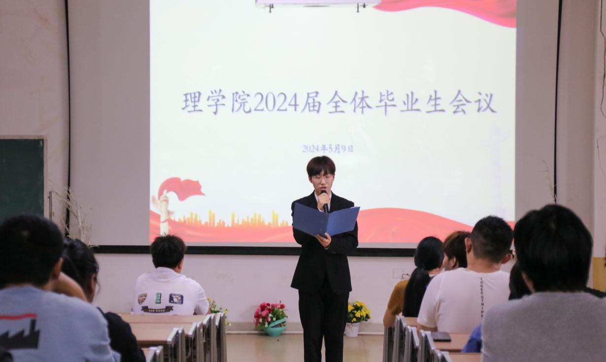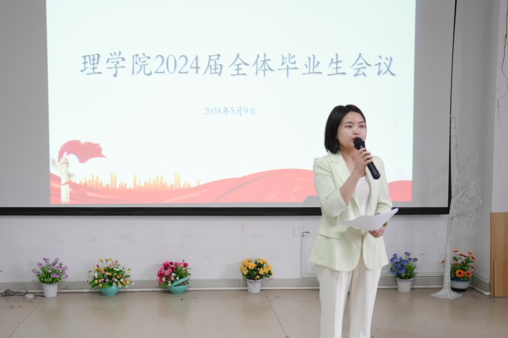 5月9日下午,理学院在数理楼608召开2024届全体毕业生会议。学院党委书记刘璟忠、副院长谢忠祥、副院长邓元祥、党委副书记傅娜、学工办主任兼分团委书记张艳霞、教研室主任刘娟和全体毕业生参加本次会议。