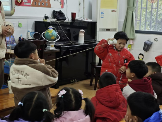 当鸡蛋随着盐粒的增加而浮出水面,小朋友们脸上都洋溢着笑容,两颗眼睛就像闪闪发光的星星;在纸杯电话实验区,小朋友们屏住呼吸,仔细地听着通过棉线传递来的声音;在浮沉子装置前,小朋友们反复上下按压瓶身,看玻璃管中的“潜水员”在液体中升降沉浮……越来越多的小朋友开始积极踊跃地尝试。