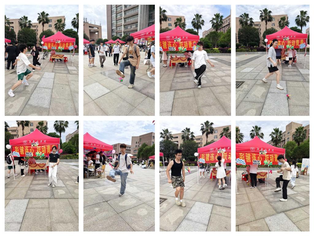 5月21日上午,理学院指南针成长中心负责的踢毽子活动区域人气高涨,充满欢声笑语。活动现场设置了“单人挑战”,兼具竞技性与娱乐性。在单人挑战区,学生们身姿轻盈,脚尖灵活翻转,毽子在空中划出优美弧线,围观者纷纷鼓掌助威
