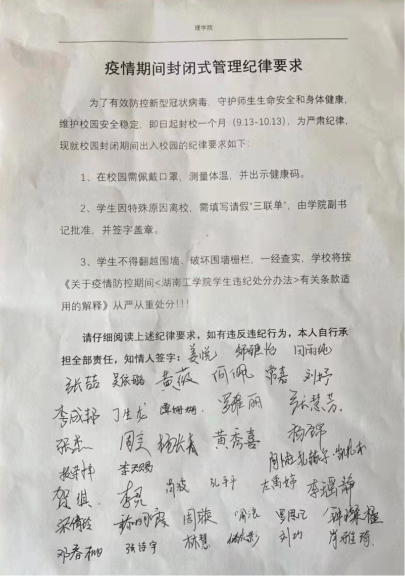 9月13-14日,在严峻复杂的疫情形势下,为全面贯彻落实学校的疫情防控政策和工作要求,理学院党委紧急部署各班组织召开疫情防控安全教育主题班会,并要求学生在“疫情期间封闭式管理纪律要求”承诺书上签名,进一步强化全院师生的防控意识,全力以赴做好疫情防控工作,做到防患未燃保安全!