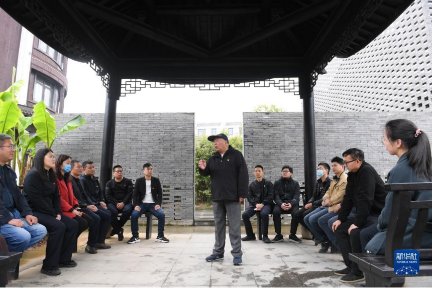 2021年4月11日,浙江诸暨枫桥镇魏廉村老党员魏杏根(中)在枫桥经验陈列馆的亭子内和年轻党员分享当年运用“枫桥经验”化解基层矛盾的故事。新华社记者 翁忻旸 摄