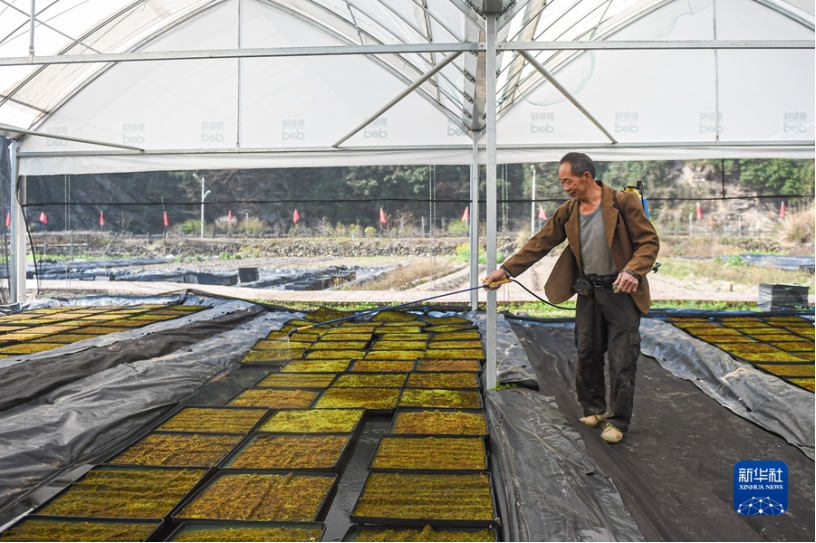 在浙江省景宁畲族自治县毛垟乡苔藓种植基地的大棚内,村民为苔藓喷洒营养液(2021年2月24日摄)。新华社记者 江汉 摄