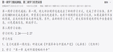 因时间紧迫,“纲要”、“原理”、“基础”、“形势与政策”等思政课主干课程开课宜早不宜迟。因此,马克思主义学院果断地制定了推进在线教学的时间进度表,要求各承担2019-2020第二学期的教学任务的老师以教务处下达的班级和课表为对象,通过启动教学平台、建立班委微信、qq群联系学生,确保2月19日准时、全面开学开课,为全校线上教学起到了良好的带头作用。