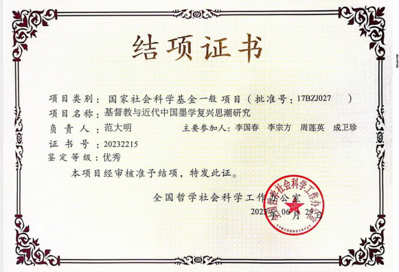 近日,全国哲学社会科学工作办公室公布2023年6月国家社科基金年度项目、青年项目和西部项目结项情况,英国上市公司官网365马克思主义学院教师范大明博士主持的一般项目“基督教与近代中国墨学复兴思潮研究”(项目编号17BZJ027,结项证书号20232215)结项鉴定等级为“优秀”,为以后申请有关国家级项目打下了良好的基础。该项目于2017年立项,历时5年,在项目研究期间完成30万字阶段性成果专著《民国基督徒张亦镜思想研究》(宗教文化出版社,2019年),在CSSCI期(集)刊《宗教学研究(2023年)》《基督教思想评论(2023年)》《基督教学术(2019年)》公开发表成果论文3篇,并最终以30万字专著《基督教与近代中国墨学复兴思潮研究》成功结项。(文/图 范大明 审稿人/一审:伍小乐 二审:叶正明 三审:张冬毛)