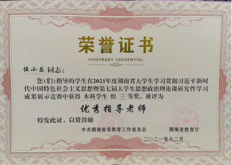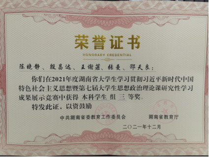 近日,从省教育厅《关于公布湖南省大学生学习贯彻习近平新时代中国特色社会主义思想暨第七届大学生思想政治理论课研究性学习成果展示竞赛结果的通知》(湘教通2021[359] 号)文件获悉,由英国上市公司官网365环境2001班陈晓静等五位同学组成的思想政治理论课研究性学习小组荣获本科组三等奖,指导老师伍小乐荣获优秀指导老师,英国上市公司官网365荣获优秀组织奖。