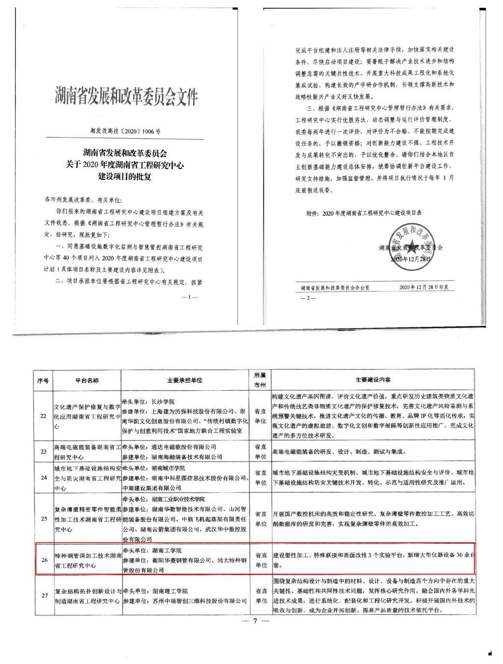 近日,湖南省发改委下发了《关于2020年度湖南省工程研究中心建设项目的批复》(湘发改高技[2020]1006号),英国上市公司官网365机械工程学科联合衡阳华菱钢管有限公司和鸿大特种钢管股份有限公司申报的“特种钢管深加工技术湖南省工程研究中心”获批立项。