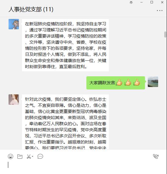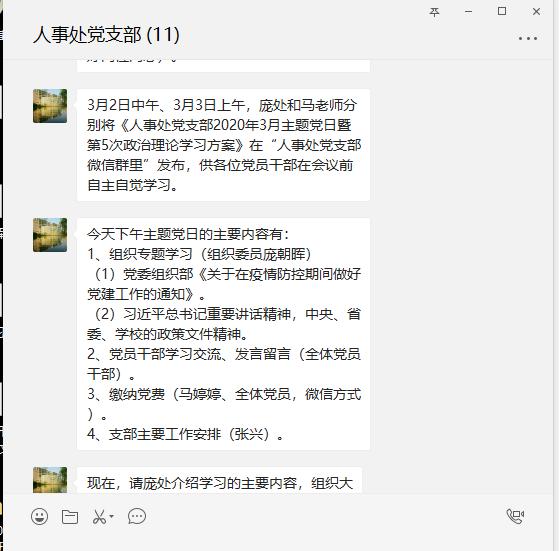 根据学校党委要求,以及党委组织部2020年3月1日发布的《关于在疫情防控期间做好党建工作的通知》精神,人事处党支部于2020年3月3日下午2:30通过线上学习(人事处党支部微信群),主要议题为3月份主题党日暨第5次政治理论学习。