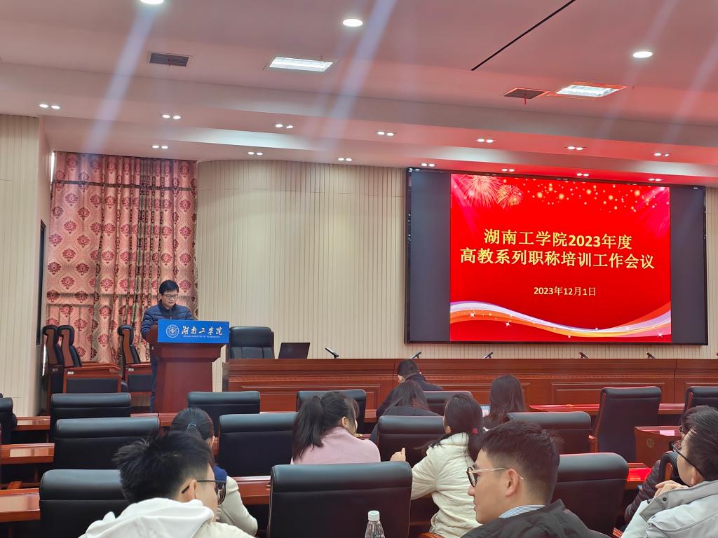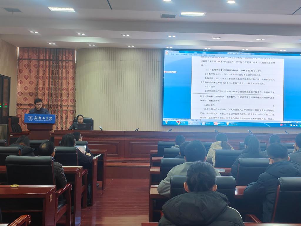 为顺利推进2023年度职称评审工作,12月1日在教学大楼12楼报告厅召开2023年度高教系列职称评审工作培训会议,会议由职改办主任肖奎主持,教务处、科技处、职改办相关工作人员和2023年高教系列职称参评人员参加了培训会议。