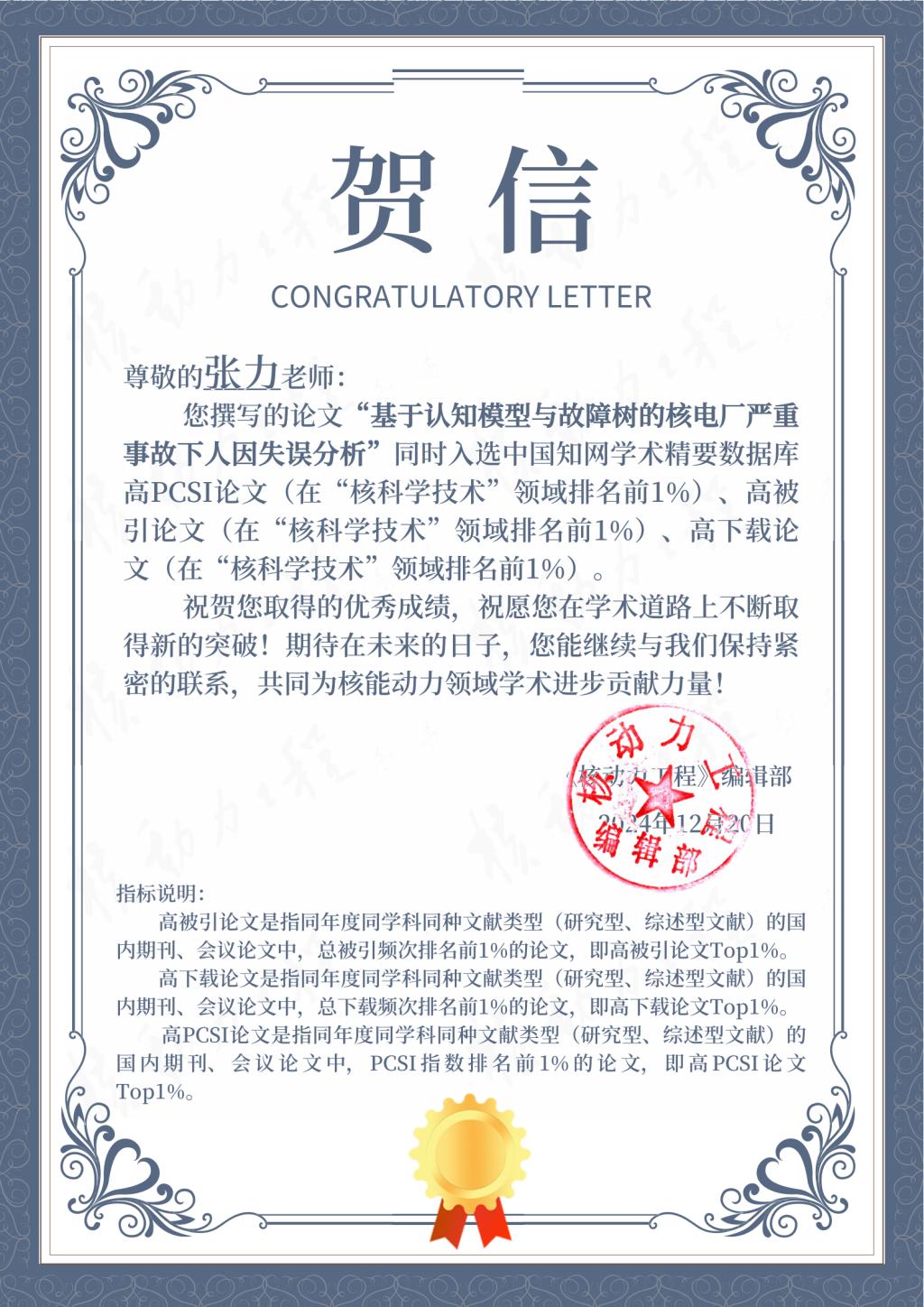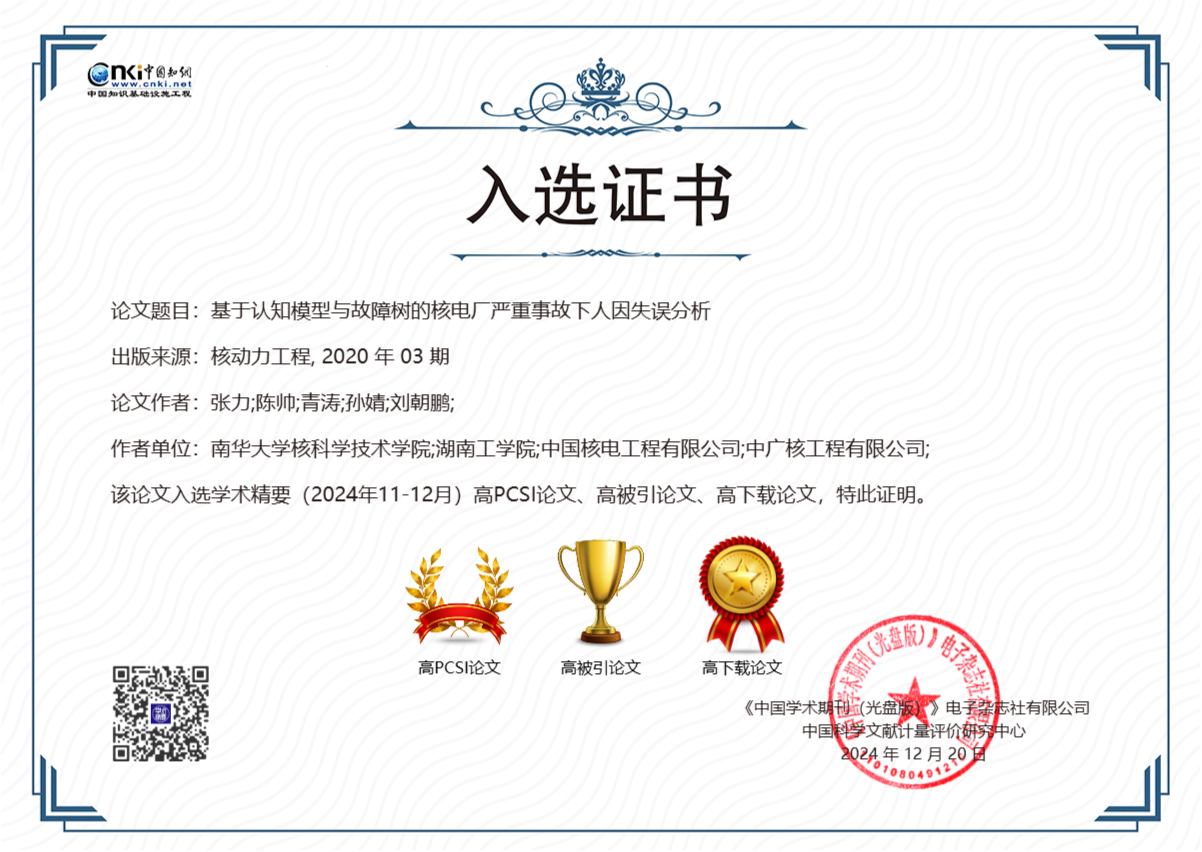 近日,中国知网(CNKI)《学术精要数据库》(https://xsjy.cnki.net/)发布了(2011~2022年)高影响力论文,分别按照被引频次、PCSI指数(论文引证标准化指数)、下载频次遴选出各学科前1%的论文,即高被引论文、高PCSI论文及高下载论文。我院人因研究团队张力教授为第一作者,陈帅博士、安全与管理工程学院副院长青涛博士、中国核电工程有限公司、中广核工程有限公司相关研究人员为主要作者,发表在《核动力工程》(中国核工程领域T1级期刊、EI期刊)的研究论文《基于认知模型与故障树的核电厂严重事故下人因失误分析》同时入选中国知网学术精要数据库高PCSI论文(在核科学技术领域排名前1%)、高被引论文(在核科学技术领域排名前1%)、高下载论文(在核科学技术领域排名前1%)。