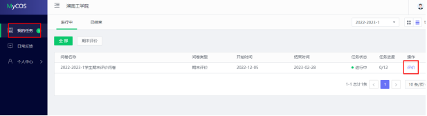 登录后,点击【我的任务】,查看【进行中】任务中的问卷,点击问卷即可参与评价。