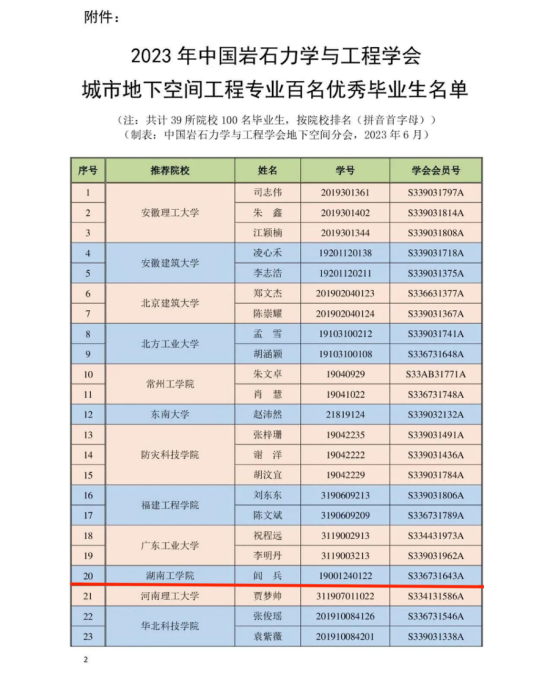 近日,中国岩石力学与工程学会发布了《关于2023年中国岩石力学与工程学会城市地下空间工程专业百名优秀毕业生的通报》,经全国十一所高校城市地下空间工程专业领域的专家组成评审委员会评定,决定授予全国39所高校的100位同学为“2023年中国岩石力学与工程学会城市地下空间工程专业优秀毕业生”荣誉称号,英国上市公司官网365城市地下空间工程专业2023届毕业生闾兵同学获此殊荣。