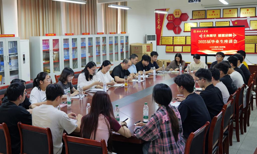 5月22日下午,土木与建筑工程学院“土木菁华 感恩启航”2025届毕业生座谈会在建工楼6201会议室举行。院党委书记黄卫华、党委副书记陈浩、学工办主任陈晔婷、副主任买明、毕业班全体辅导员和20名毕业生代表齐聚一堂,共话成长与感恩,通过视频展播、代表发言、互动交流、书记寄语等环节,为毕业生送上真挚祝福。