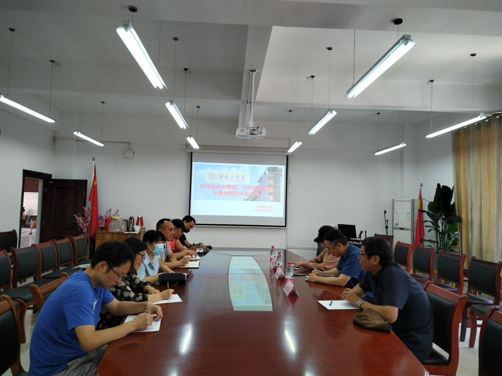 526日上午,湖南工程学院外国语学院前院长杨永和教授、伊达英语考培中心司先新董事长、湖南科技大学朱曼利教授来我院交流一流专业建设和剑桥商务英语(BEC)考点持续建设合作事宜。党委书记刘斌、副院长谢争艳、各教研室、实验室、学工办主任参会,座谈会由副院长谢争艳主持。