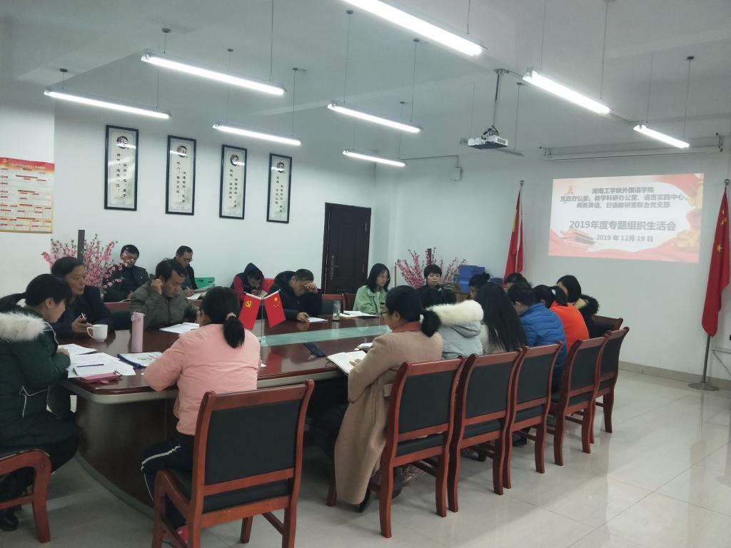 2019年12月19日,英国上市公司官网365外国语学院党政办公室、教学科研办公室、语言实践中心、商务英语、日语教研室联合党支部于外语楼317召开2019年度组织生活会和党员民主评议大会。校党委委员、组织部部长黄红卫到会指导,会议由党支部书记谢争艳主持,外国语学院院长、党委副书记张平和党支部全体党员参会,5名党外教师代表列席会议。