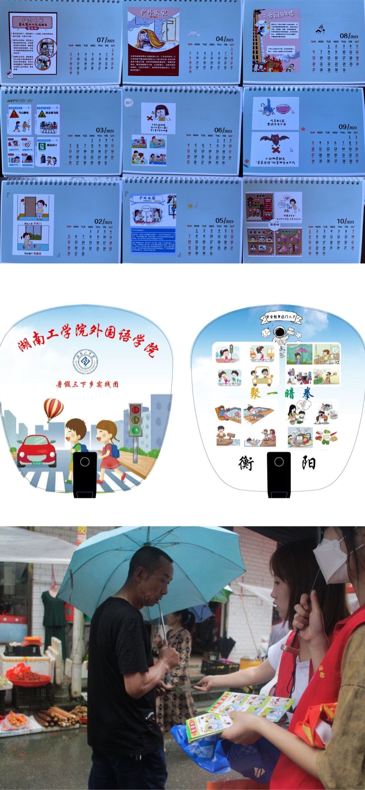 外国语学院赴西渡镇“三下乡”暑期实践队以集实用与文艺为一体的方式,将防溺水、用电、食品、交通、农药使用等安全知识设计融入到带有当地语言特色的宣传册、图形并茂的扇子和年历当中,通过形象生动并贴合当地民风民俗的表现方式以及生动亲切的方言,将安全教育理念和安全微锦囊广泛传播给当地居民群众,强化乡村居民的安全意识。