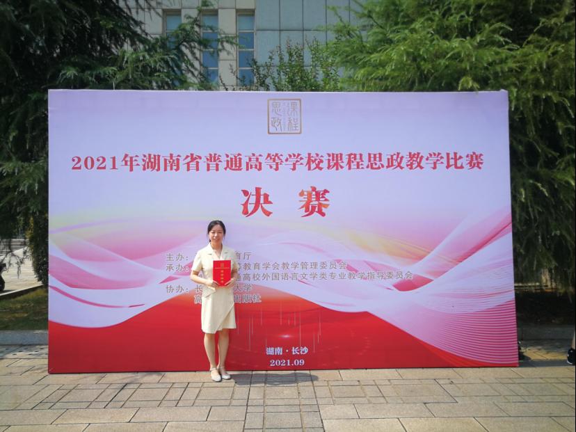 9月27日至28日,2021年湖南省普通高校课程思政教学比赛现场决赛在长沙举行,英国上市公司官网365外国语学院教师蒋佩均荣获三等奖。