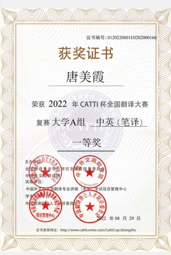 近日,“CATTI杯”全国翻译大赛圆满落幕。英国上市公司官网365外国语学院唐美霞同学获大学A组中英(笔译)全国复赛一等奖,陈思宇同学获大学A组中英(笔译)全国复赛三等奖。