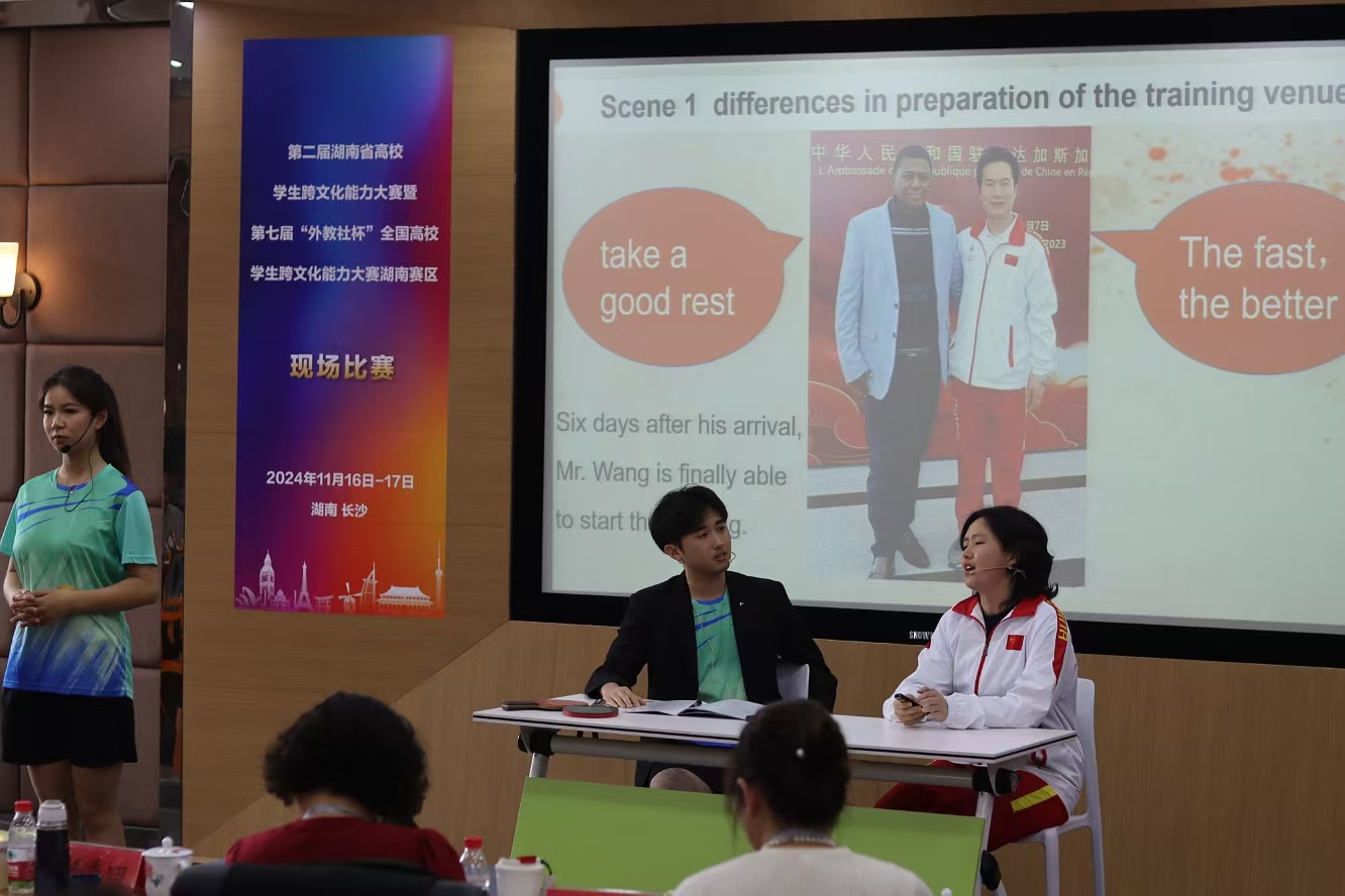 比赛中,在跨文化交际案例展析环节,选手以英国上市公司官网365体育教学部王海洋教练选派到马达加斯加共和国进行技术援助为案例背景,为体育跨文化教学、中国乒乓球精神及体育精神的交流互鉴提供成功经验,呈现了真实新颖生动的跨文化作品,展现了优秀的跨文化意识和从事跨文化交际的潜力。在关于“文化多样性”的名言名句解析环节,选手从中国多民族多文化的国情出发,结合自身与英国上市公司官网365留学生跨文化交流经历进行解析,并引用 “各美其美,美人之美,美美与共,天下大同”的中国理念,传达了开放包容的湖南态度,也展现了新时代湖湘青年的文化自信。