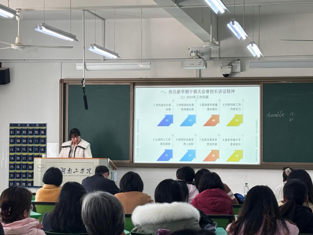 会上,副院长谢争艳传达了新学期干部大会上校长曾广胜的讲话精神并部署了新学期教学科研工作。她指出,2025年是学院发展的关键之年,我们要围绕中心服务大局,立足本职岗位,积极履职尽责。全体教职工要提高站位、对标对表、凝心聚力,为学院高质量发展贡献力量。
