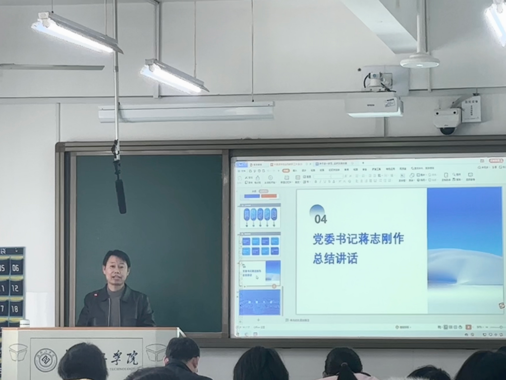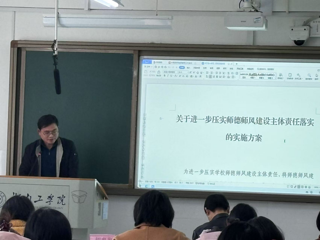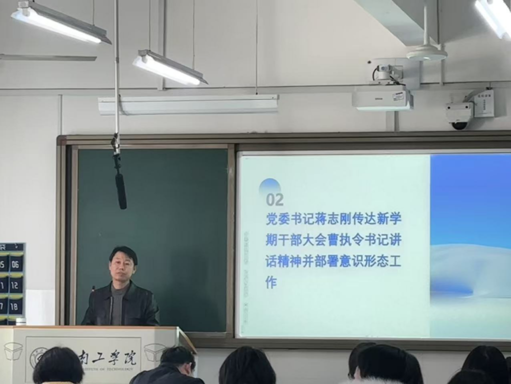 党委书记蒋志刚传达了新学期干部大会上党委书记曹执令的讲话精神,并部署了学院意识形态工作。他强调,全院上下要深入学习贯彻全省教育大会、全省教育工作会议和学校新学期干部大会精神,牢牢把握教育的政治属性、人民属性和战略属性,既谋当下,更利长远,统筹推进学校各项工作。全体教职工要统一思想,紧密团结,涵养高尚品德,为共建湖工美好家园而努力。