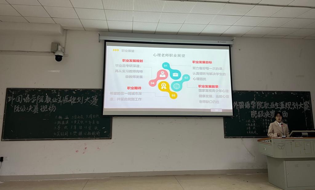 为强化大学生职业生涯规划理念,提高大学生职业素养及规划能力,促进大学生就业创业工作,11月18日晚,外国语学院在外语楼612教室举行2022年大学生职业生涯规划大赛决赛。外国语学院党委书记刘斌、党委副书记周艳红、全体辅导员出席大赛并担任评委。