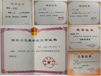 在校期间荣获国家励志奖学金2次、校级一等奖学金2次、校级二等奖学金1次、校三好学生2次、校优秀干部1次、校优秀团员干部2次、三下乡优秀个人2次。积极参与国家级大学生创新创业项目、挑战杯等活动,取得良好成绩。