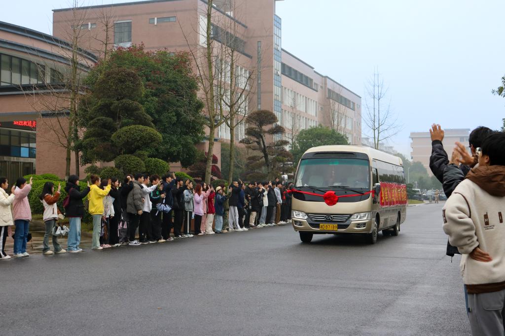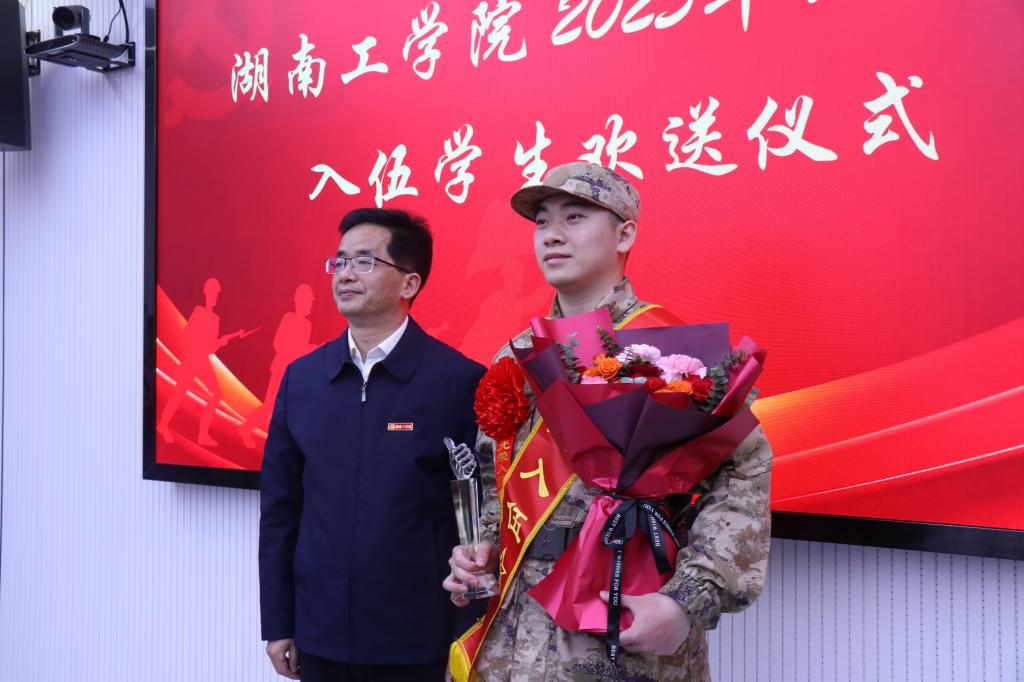 袁勤为应征入伍同学逐一披挂"光荣入伍"绶带,赠上刻有校徽的纪念品和鲜花。他高度肯定学校征兵工作成效,勉励应征入伍同学将专业知识融入强军实践,在军营大熔炉中继续加强学习,淬炼过硬军事本领,早日成为一名“听党指挥、能打胜仗、作风优良”的新时代好战士,以优异成绩为国家为母校增光添彩。