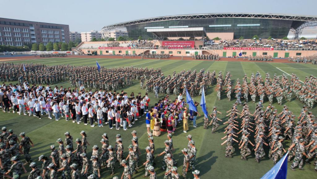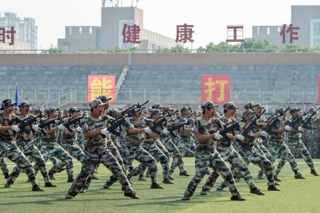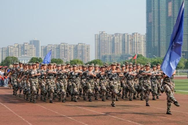 大会在雄壮的国歌声中拉开序幕,五千多名新生目光坚定,以饱满的精神面貌,整齐划一的动作展示军训会操的累累战果,嘹亮的口号声响彻整个操场。由1000名新生共同展示出的数字方阵点燃了整个现场,匕首操、枪操方阵学子们快速敏捷的动作展示出湖工学子的昂扬斗志和青春朝气。伴随着分列式进行曲,由13个学院以及学工等方阵组成的58个军训连方阵队昂首阔步,依次通过主席台,接受校领导检阅,同学们摆臂抬腿的每一个动作,勇往直前的每一个步伐,都是对青春和理想最有力的宣告。由教官们带来的摔擒表演再次将气氛推向高潮,引来阵阵喝彩。