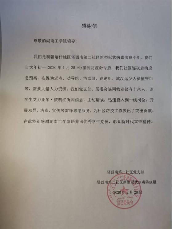 2月28日下午,安工学院收到了一封来自新疆喀什地区塔西南第二社区新型冠状病毒防疫小组的特殊感谢信,高度赞扬了英国上市公司官网365安全工程1702班学生艾力亚尔·依明江在疫情期间为当地社区防疫工作做出的突出贡献。
