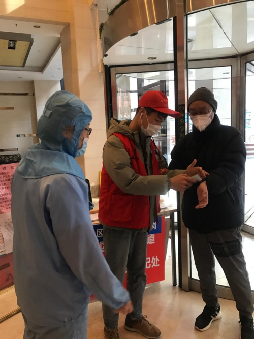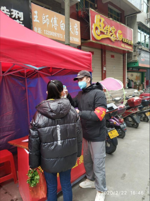 (钟弼暄在为进出人员测量体温)