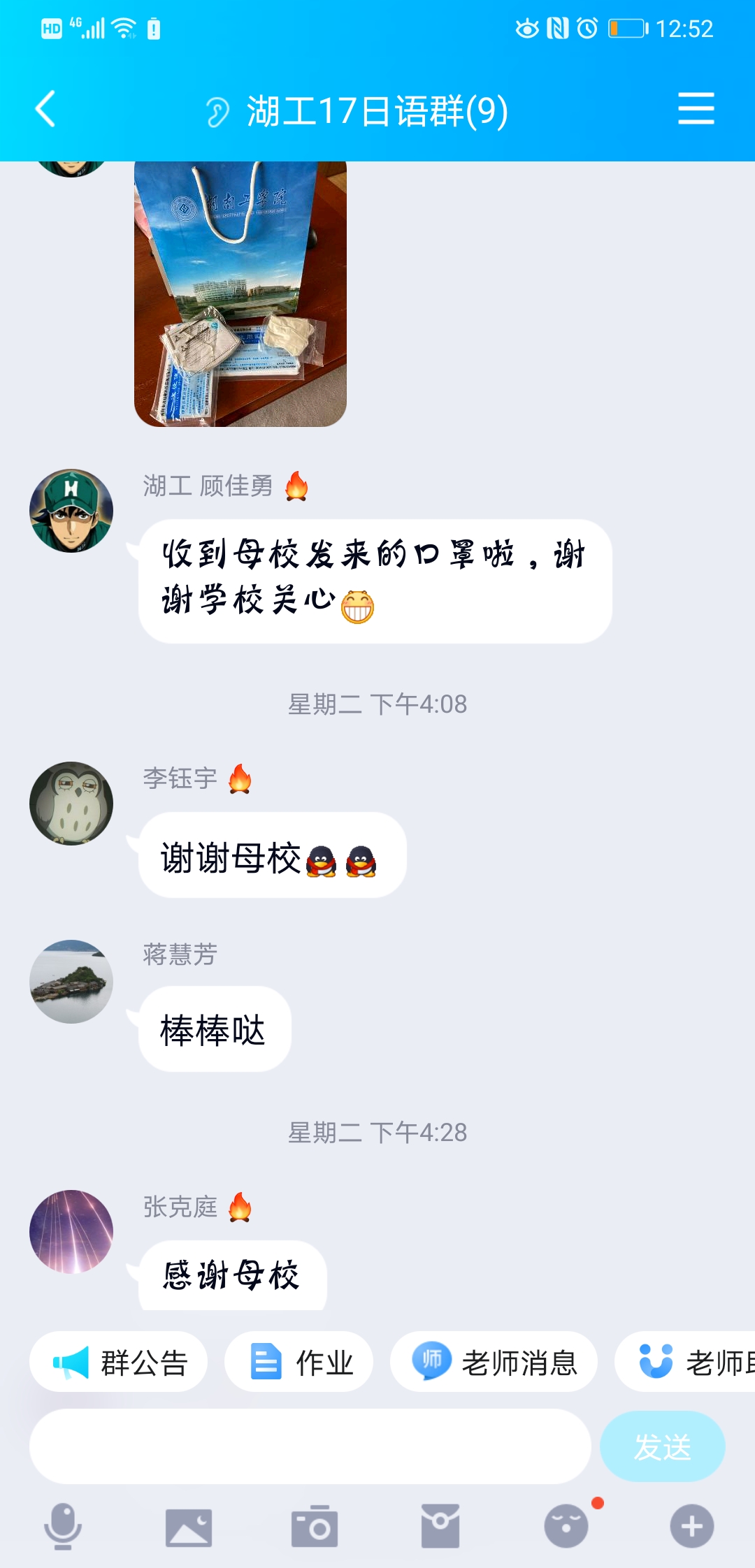 近日,9名在日留学生收到了学校为他们寄送的第一批口罩、手套等抗疫“爱心包”和“致湖工海外学子的一封信”。海外疫情爆发以来,学校时刻高度关注海外学子的安危,并将全体海外学子纳入学校整体防控工作的监控范围,要求相关部门做好他们的抗疫知识普及和心理辅导等工作,掌握他们在海外的学习和生活情况,了解他们遇到的困难,并尽全力进行帮助。国际合作交流处和相关二级学院成立了专门的工作小组,建立疫情防控台帐,指定专人与海外学子及他们的家长联系,并定期通过微信、QQ等方式宣传应对疫情措施和防控知识,提醒海外学子注意安全、科学防控