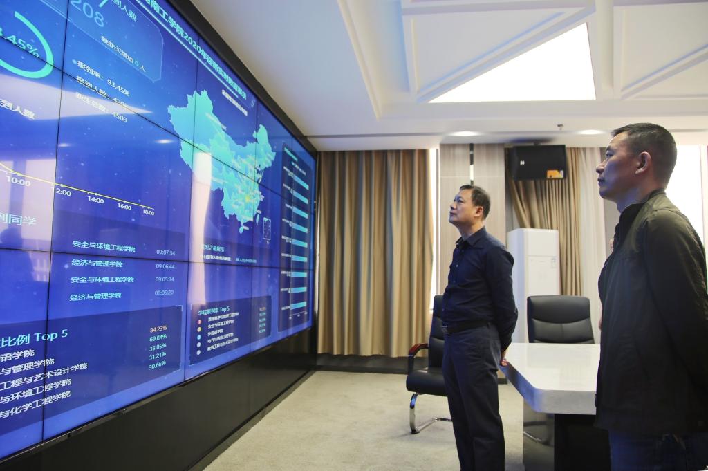 在智慧校园指挥中心指挥调度迎新和疫情防控工作
