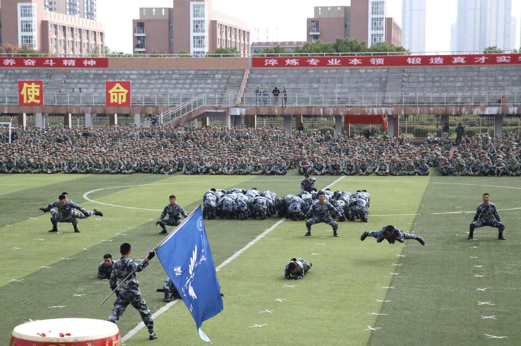 在方阵表演阶段, 2020级新生的应急救护展示、新生匕首操方阵表演、军体拳方阵表演,将信念与力量结合,出拳刚劲有力,踢腿凌厉迅猛,充分展示了2020级新生军训的骄人成果。随后是军训教官的擒敌拳和倒功操表演,现场欢呼不断,掌声不断。伴着雄壮激昂的分列式进行曲,4400余名接受军训的2020级新生带来了军训分列式表演,他们迈着矫健有力的步伐,喊着激情澎湃的口号,依次通过主席台,接受校领导检阅。