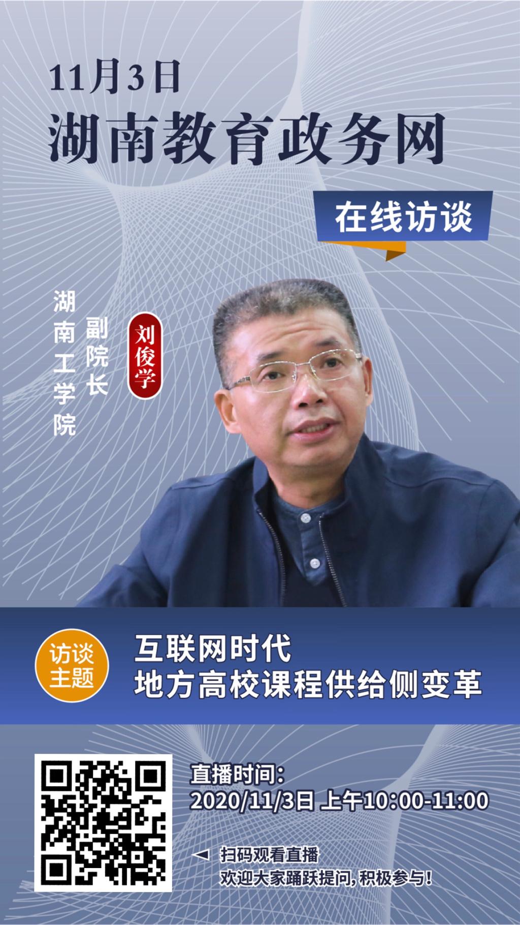 11月3日上午10点至11点,英国上市公司官网365党委委员、副校长刘俊学将做客湖南教育政务网在线访谈,就“互联网时代地方高校课程供给侧变革”这一主题与主持人及网友进行在线交流,欢迎广大师生扫描海报二维码观看直播,踊跃提问,积极参与。