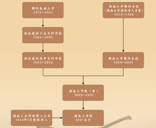 原湖南建材高等专科学校和原湖南大学衡阳分校均创建于20 世纪70 年代中期。两校经历了建校初期的筚路蓝缕,曲折坎坷,广大教职工克服困难,努力工作,形成了“无私奉献,开拓进取,睿智圆融,追求卓越”的精神。这一精神薪火相传, 激励着湖工人努力拼搏, 勇创辉煌。