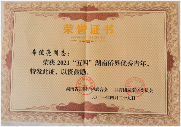 辛俊亮同志荣获2021“五四”湖南侨界优秀青年