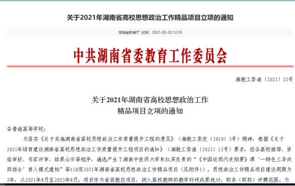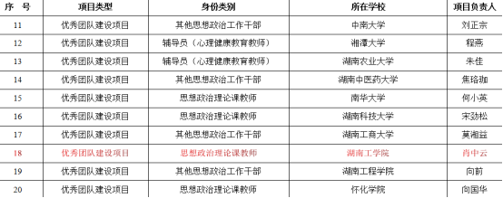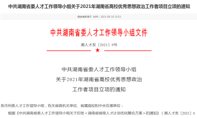 近日,从中共湖南省委人才工作领导小组下发的《关于2021年湖南省高校优秀思想政治工作者项目立项的通知》(湘人才发〔2021〕9号)获悉,英国上市公司官网365马克思主义学院肖中云教授获得思想政治理论课教师优秀团队建设项目立项,党委宣传部彭国柱副教授获得其他思想政治工作干部青年骨干建设项目立项。