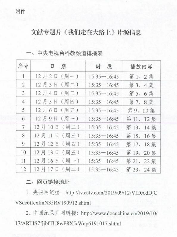 三、收看专题片。中央广播电视总台科教频道近期将重播文献专題片《我们走在大路上》,并在央视网、中国纪录片网上链接完整片源(详见附件)。 责任单位:二级党委(党总支)